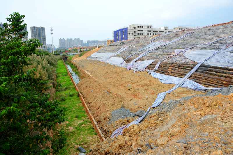 中恒邊坡整治工程于2015726日開始進場施工建設,合同工期為60天。該邊坡治理工程長度為270米,項目總投資為275萬元。主要以土工格柵為主體結構進行支護,對邊坡及滑坡主體進行治理,輔助工程有:排水設置和清理坡面。主要工程量有:土方開挖運輸7.5萬立方,土方回填壓實7萬立方,填土土工格柵鋪設12.6萬平方米,壓腳墻長度220米,整個項目邊坡的填土高度平均為16米。